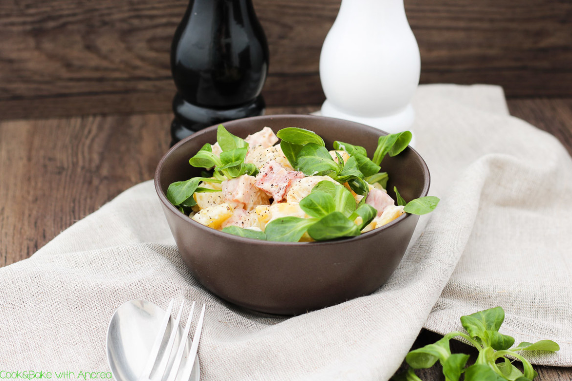 Letztes Jahr im Sommer habe ich euch schon mal ein Rezept für Kartoffelsalat vorgestellt. Dieser war aber vegetarisch und weniger deftiger wie dieses Rezept. Im Winter darf es aber bei mir durchaus ab und zu etwas deftiger sein. Deswegen ist mein Kartoffelsalat mit einem Mayodressing angemacht und wird durch angebratene Zwiebel und Speck verfeinert. Allerdings wollte ich noch eine feine nussige Note dazu, deswegen habe ich mich für eine Handvoll Feldsalat untergemischt.