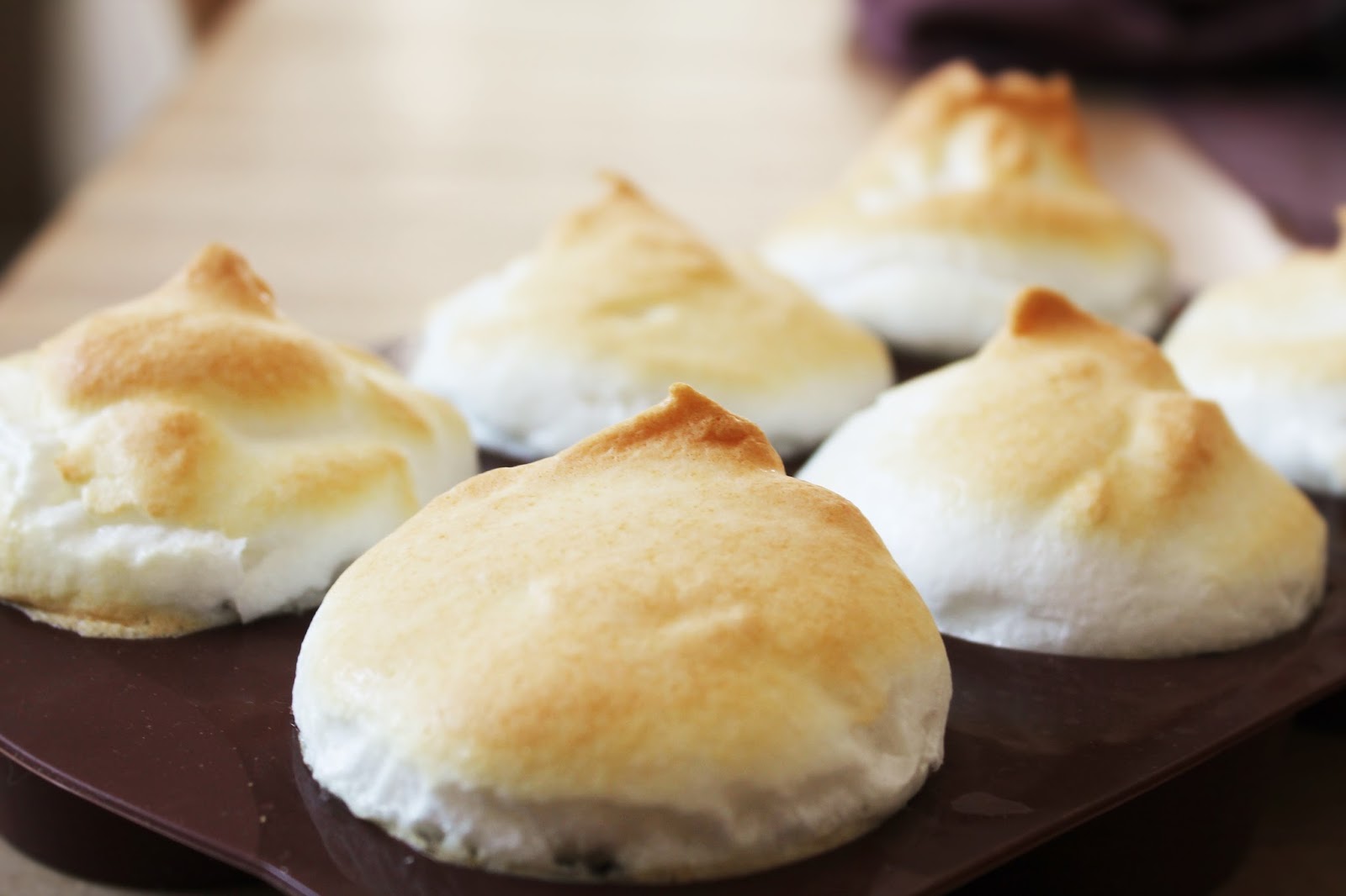3. Den Teig in die Förmchen geben und bei 180 Grad 20 Minuten backen. Inzwischen die Eiweiße mit 100g Xucker steif schlagen. Den Backofen auf 150 Grad runterdrehen. Eischnee auf den Muffins verteilen und noch weitere 10 Minuten backen, bis die Baisermasse leicht gebräunt ist.