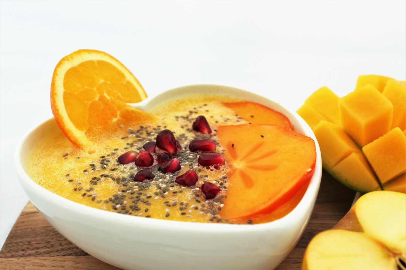 Ananas ist nicht nur fruchtig lecker, sondern enthält auch eine Vielzahl an Vitalstoffen und Enzymen. Unter anderem enthält die Ananas Calcium, Magnesium, Kalium, Eisen, Jod und Zink. All diese Stoffe sind absolut notwendig für unseren Körper, um gesund und fit zu bleiben. Der Granatapfel bekämpft mit seinen Zusatzstoffen Entzündungen und schützt die Gefäße. Genau das, was der Körper an kalten und dunklen Wintertagen braucht! Außerdem finde ich die Kombi, aus der süßen Ananas und der sauren Orange wirklich passend. Die Granatapfelkerne geben dem ganzen noch den nötigen knackigen Frischekick. Die Chiasamen, mit ihrem hohen Omega-3-Fettsäuren sind ja nicht umsonst als Superfood bekannt, heben den Nährwert diesen Smoothies nochmal enorm hoch, da kommt man gut durch die Winterkälte. Die Farbe stimmt auch schon auf Sommer, Sonne und Wärme ein und bekämft jegliche schlechte Laune. Also ran an den Mixer und mischt euch gute Laune!