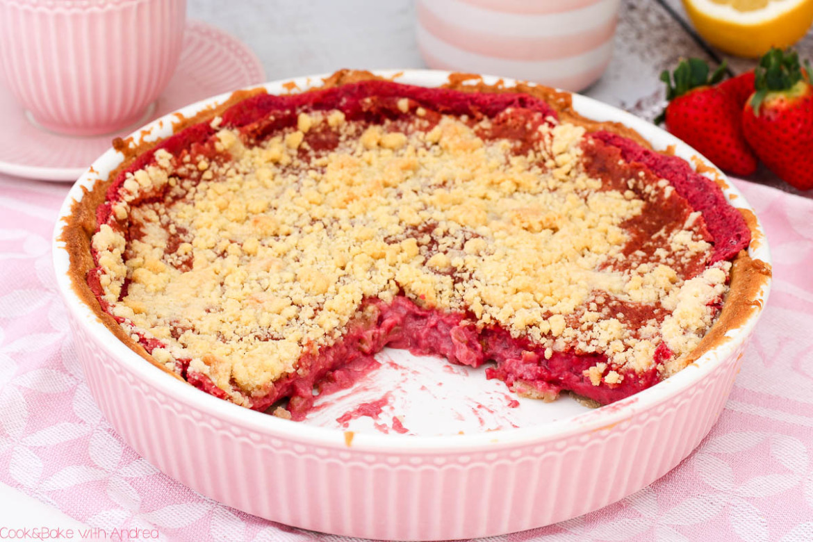 Dieser Streuselkuchen schreit gerade zu nach Frühling. Rosa ist einfach immer ein Hingucker.