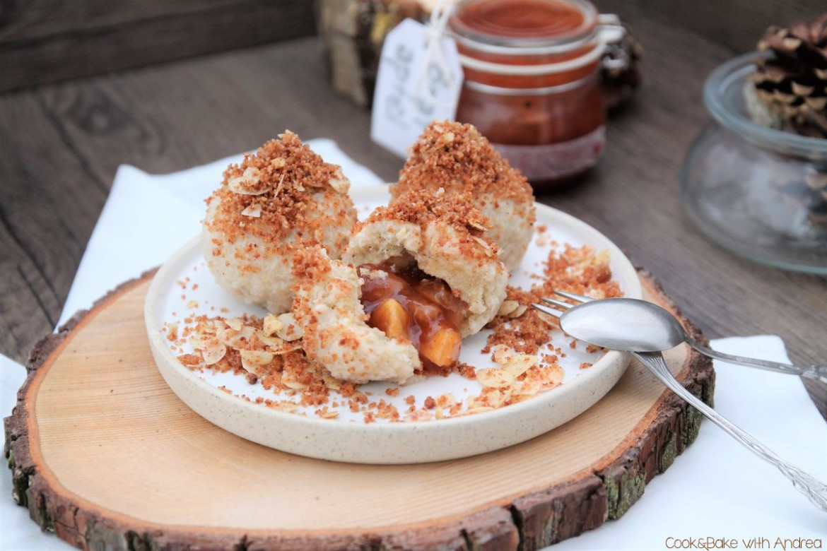 Zu guter Letzt habe ich eine Nachspeise für euch, die ich schon lange mal machen wollte und zwar sind das leckere Topfenknödel mit Marmeladen-Füllung. Dazu gibt es noch Mandelbrösel mit ganz viel Zimt. Bei der Marmelade könnt ihr natürlich je nach eurem Geschmack wählen. Ich habe mich für Bratapfel Marmelade entschieden (das Rezept dafür gibt’s schon übernächsten Montag).